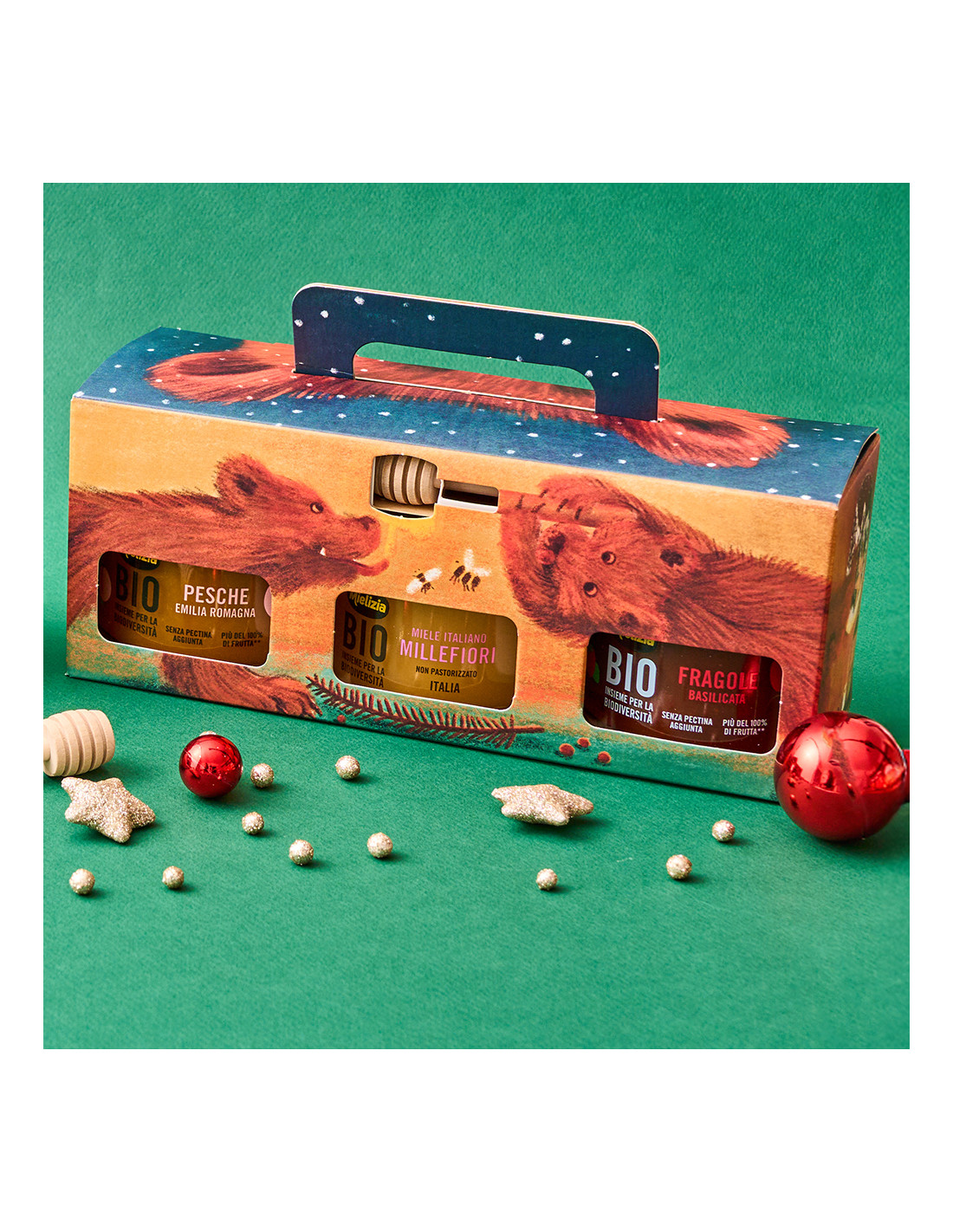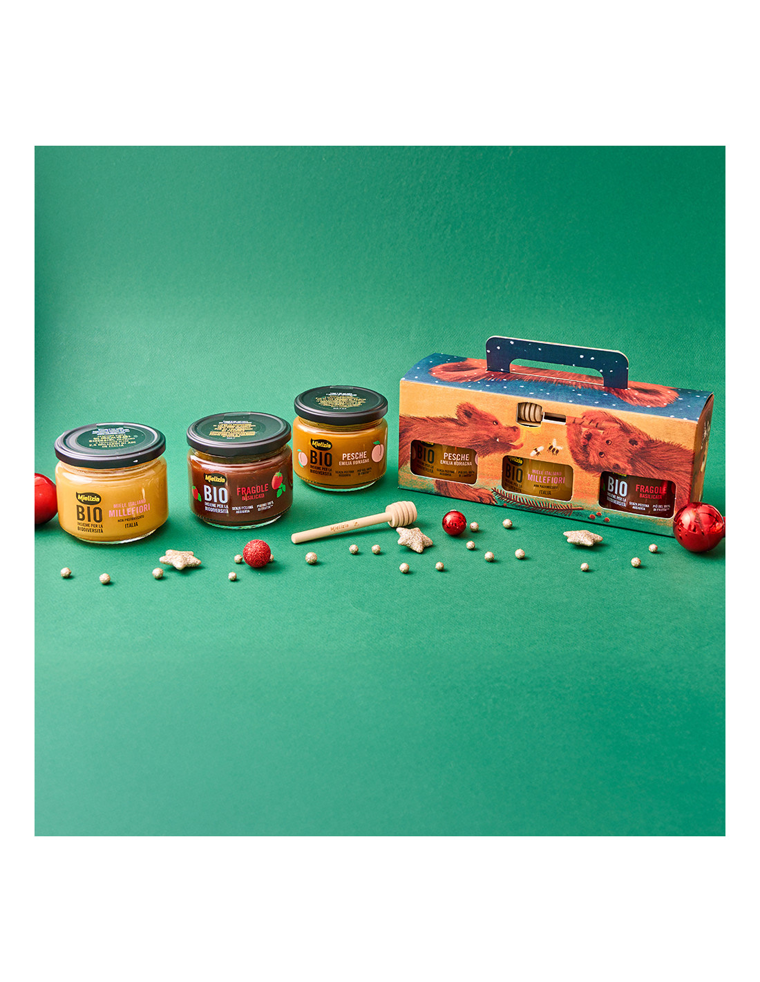 Contents: 1 250g jar of organic peach compote, 1 250g jar of organic strawberry compote, 1 300g jar of organic Italian wildflower honey, 1 Mielizia wooden honey dipper.