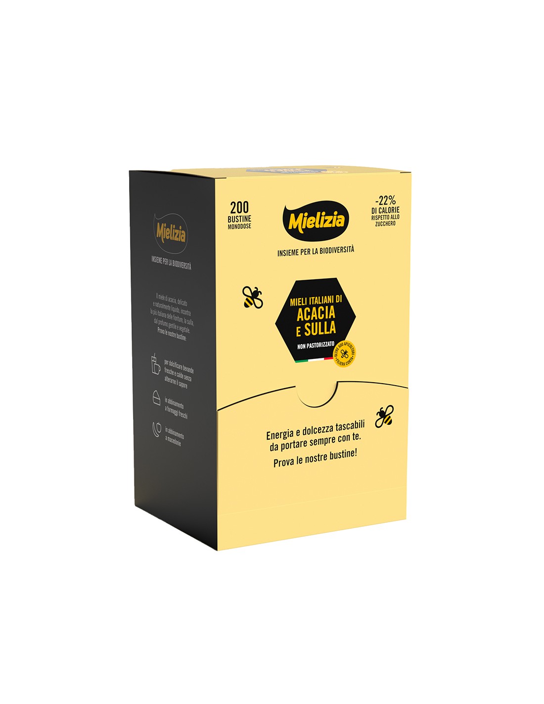 Mielizia dispensers offer a range of Italian honeys packaged in convenient, ready-to-use single-serving sachets, so you never run out of energy, wherever you are. The sachets are also ideal for athletes and students.