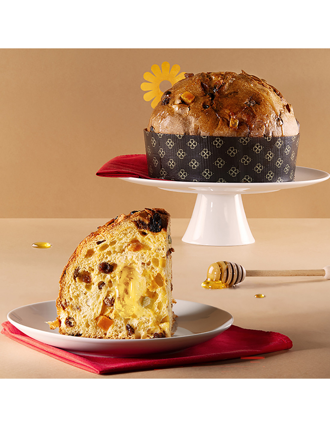 Product baked naturally leavened: Panettone with sultanas and candied citrus fruits, filled with honey cream.