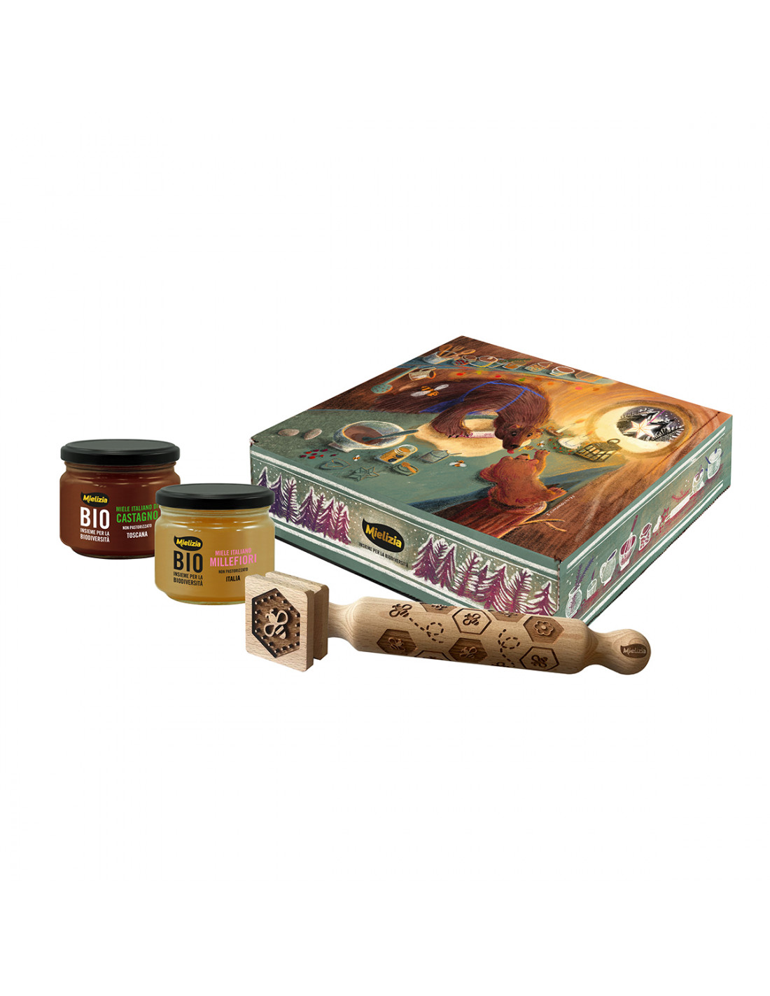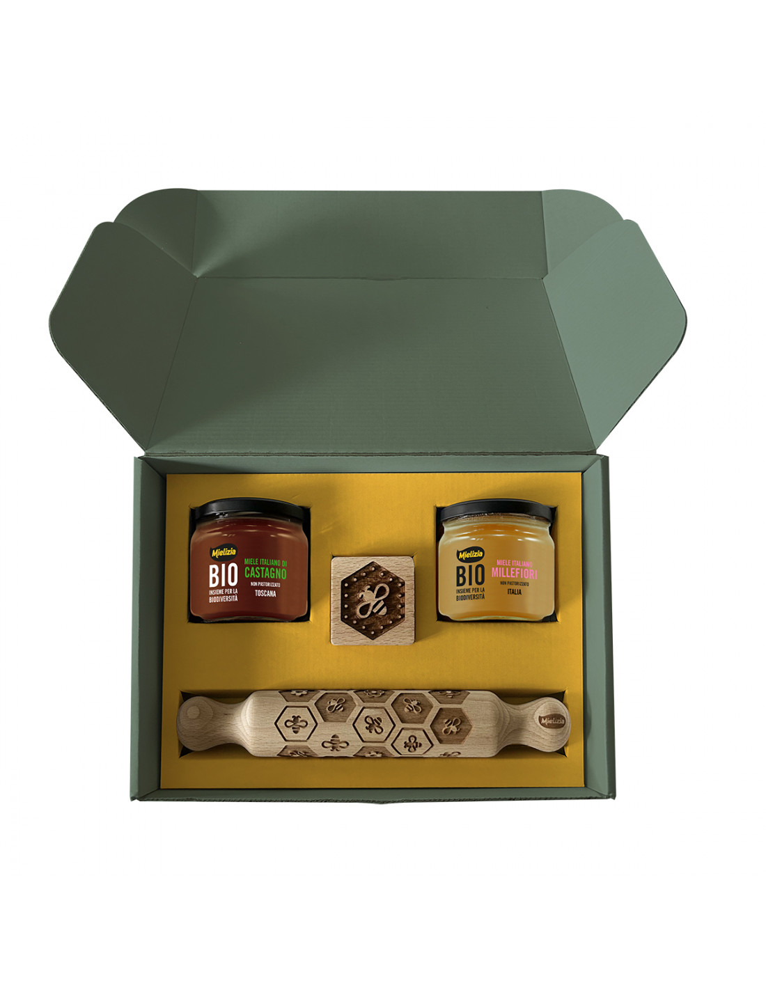 Contenuto: 1 vasetto di miele biologico millefiori italiano da 300g, 1 vasetto di miele biologico di castagno italiano da 300g, 1 mattarello in legno con decorazione, 1 timbro in legno per biscotti con decorazione.