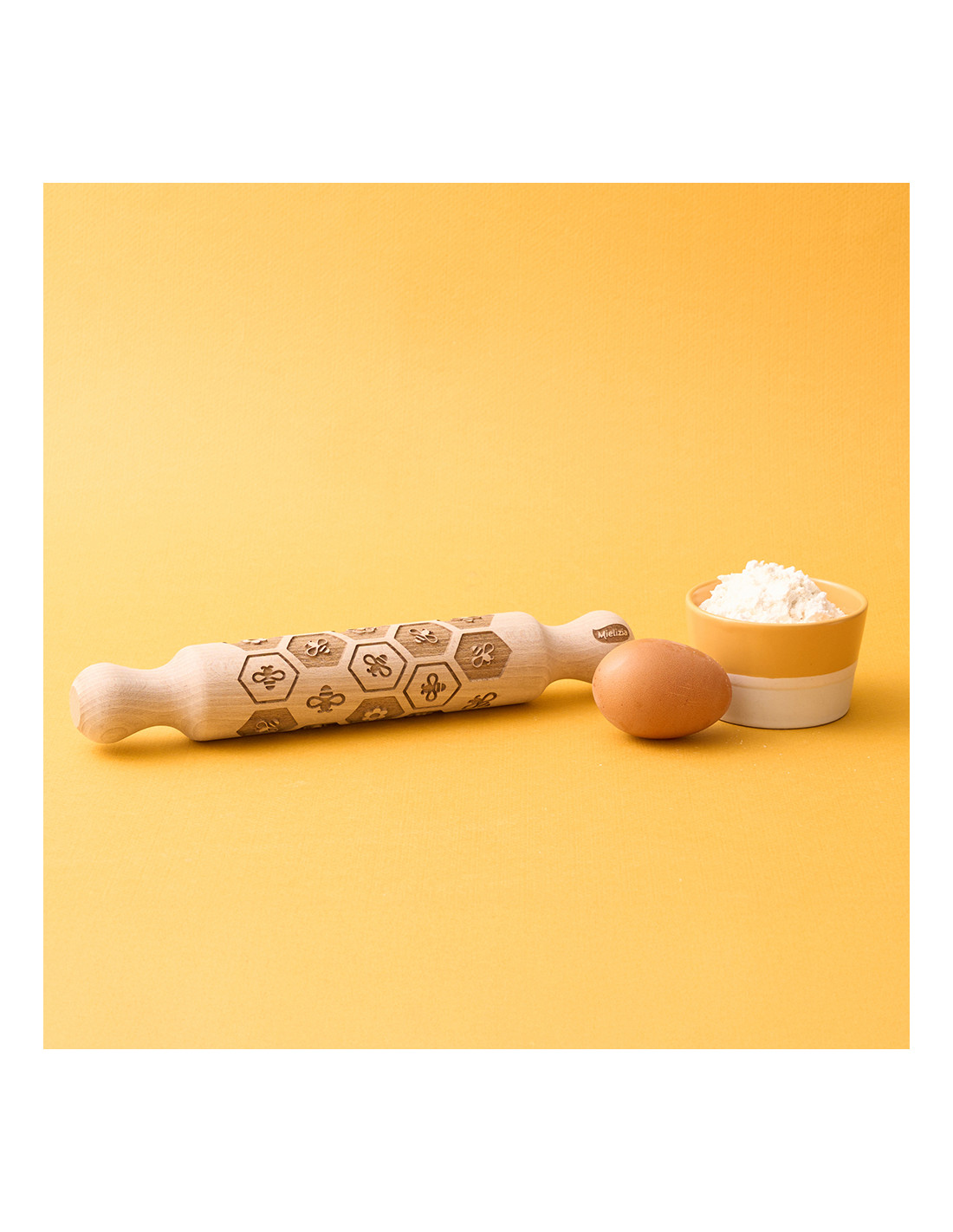 Un mattarello in legno di faggio da Leonardi Wood e inciso con un motivo che unisce esagoni, fiori e la nostra inconfondibile ape Mielizia. Un pattern che richiama l’alveare e celebra il mondo delle api con eleganza e originalità.
